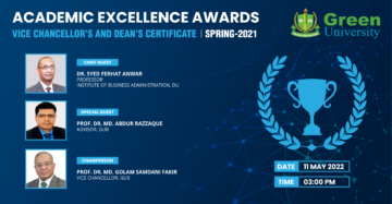 The Academic Excellence Awards: Vice Chancellor’s and Dean’s certificates of honor will be distributed on Wednesday, the 11th May 2022 at 3.00 pm among the meritorious students of Green University of Bangladesh for their outstanding results in the spring semester 2021.